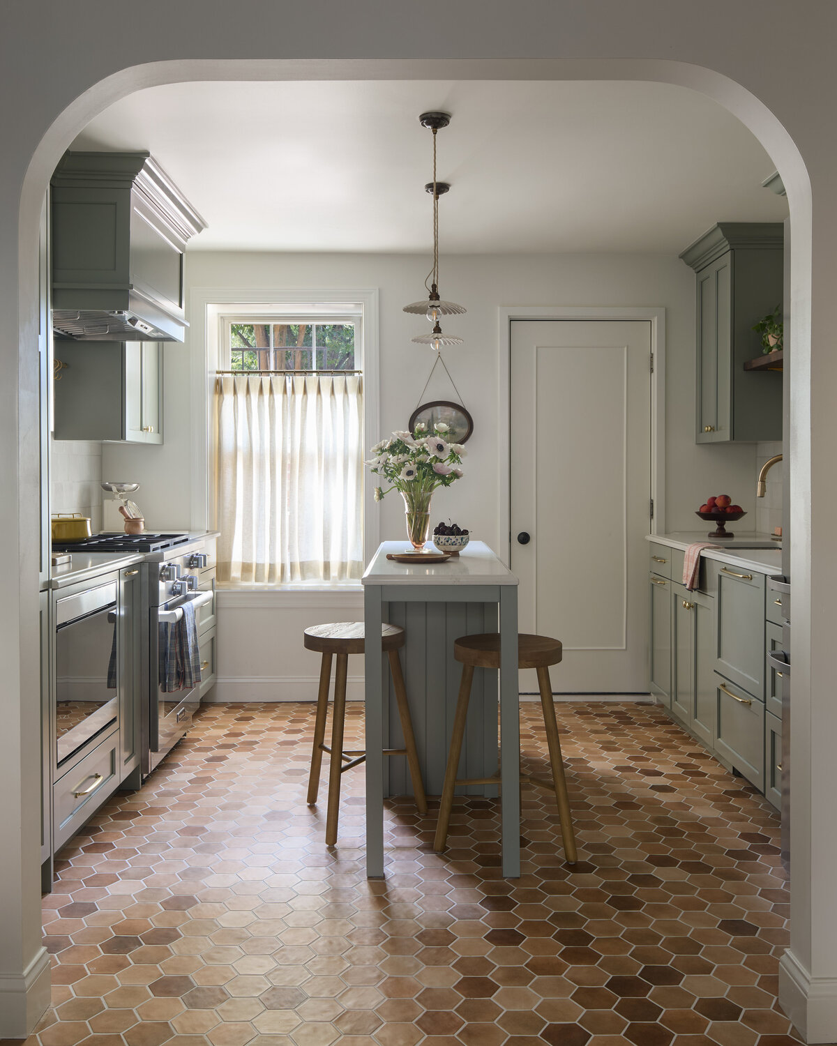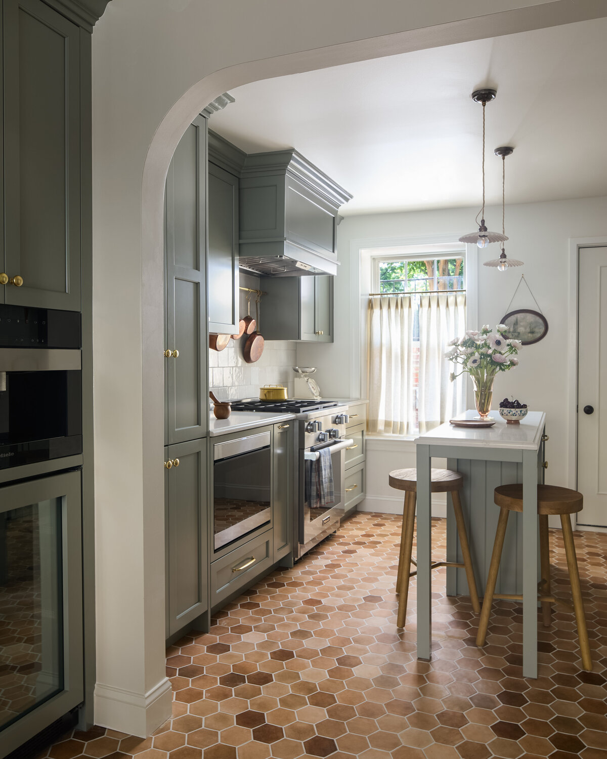 The transformation honors the home’s original character while maximizing its compact footprint. An arched opening between the kitchen and dining area improves light and flow, and custom built-ins and clever storage solutions enhance functionality. Swapping out a bulky fireplace for a sleek gas unit expanded the living space without sacrificing charm. Personal touches—a cherished chandelier, curated art, and a mix of materials in a warm color palette—bring the vision to life, harmoniously blending coastal warmth with Swedish minimalism.