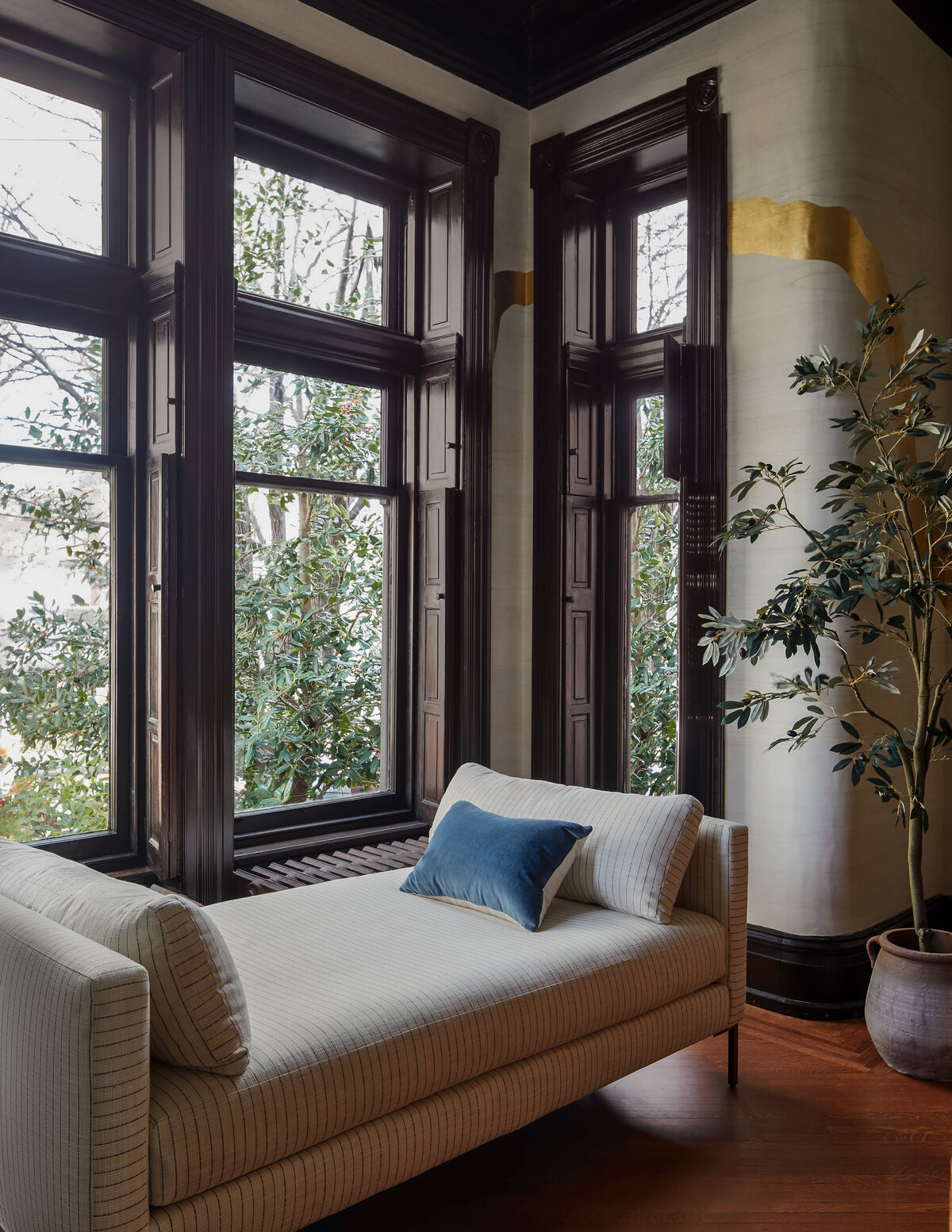 We infused this 1885 home with a “Vivacious Vintage” spirit to match our client’s lively personality and love for entertaining. The primary bedroom stands out with its dramatic wallpaper, complemented by Inchyra Blue trim and scalloped sconces, creating a space that’s both romantic and unexpected.